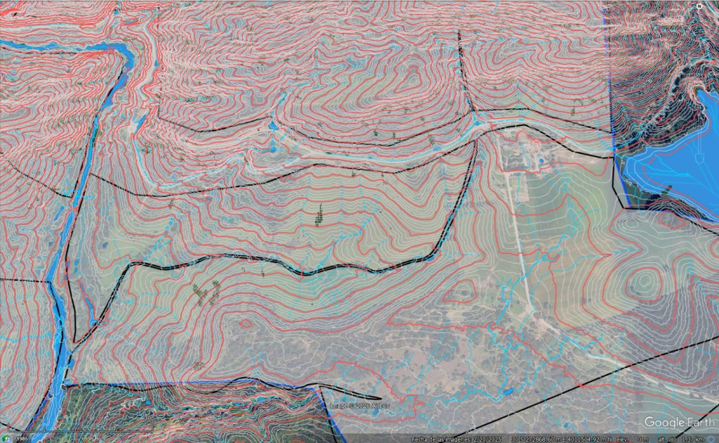 Antes de salir al campo, revisamos junto a Félix toda la cartografía disponible, incluyendo las capas hídricas elaboradas por Georgi Pavlov (Regrarians©). En una finca de 600 hectáreas, diseñar bien el recorrido no es un detalle menor y nos ayuda a hacer un uso eficiente del tiempo tanto de la consultora como del cliente creando una vivencia satisfactoria para las dos partes. Una consultoría hidrológica quizás comienza en el mapa, en el terreno se confirma.
